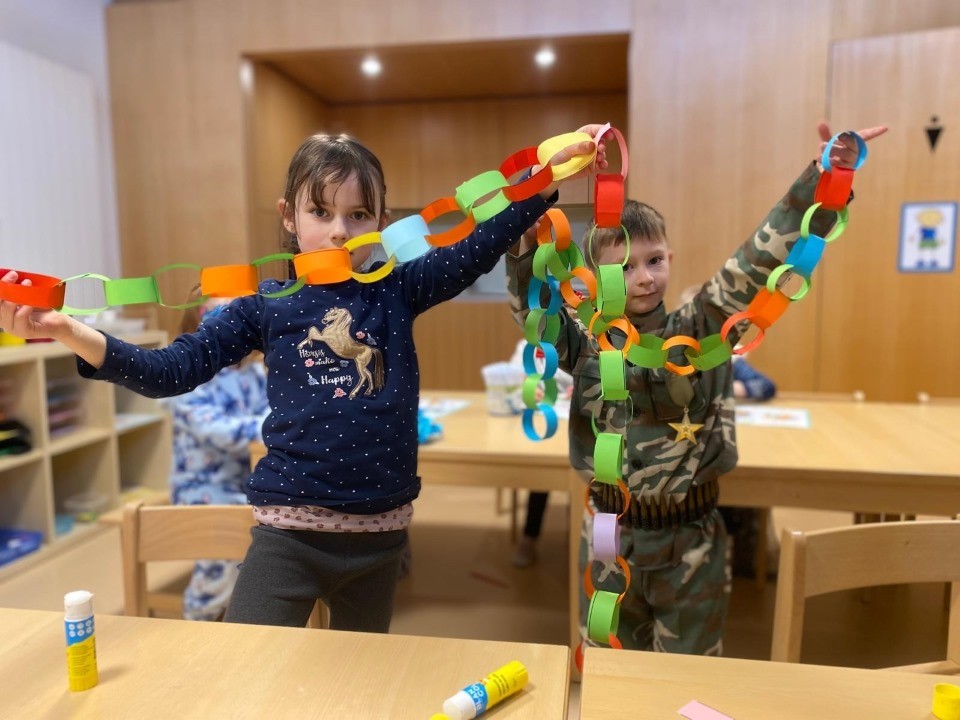 Anschliessend konnten die Kinder an drei verschiedenen Stationen teilnehmen. Mit viel Eifer lieferten sie sich ein Konfetti-Puste-Duell, bastelten gemeinsam an einer bunten Girlande oder tanzten mit einem Ballon und einem Partner um den Sieg. Überall wurde gelacht, angefeuert und mitgefiebert.